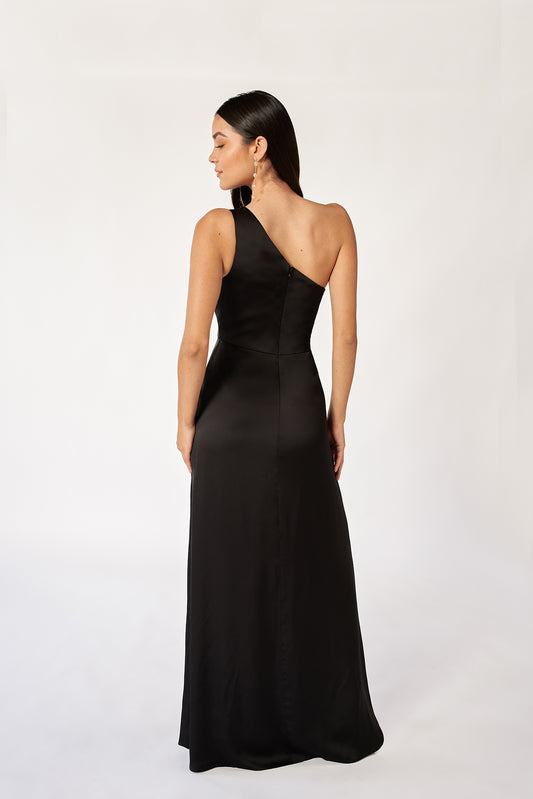 Custom Gown | Modern Lux Charmeuse A-line Gown with One Shoulder and Slim Shoulder Cut-Out