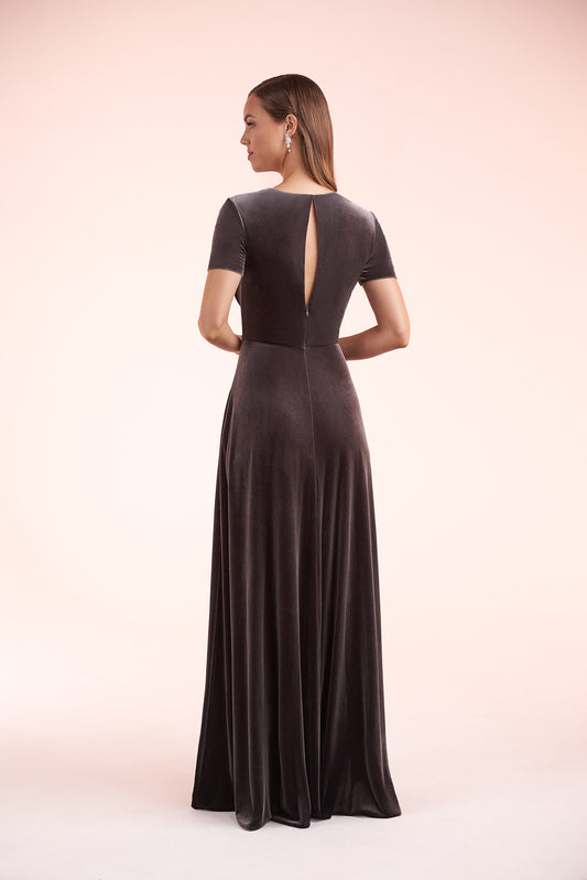 Custom Gown | Elegant A-Line Stretch Velvet Gown with Queen Anne Neckline and Short Sleeves