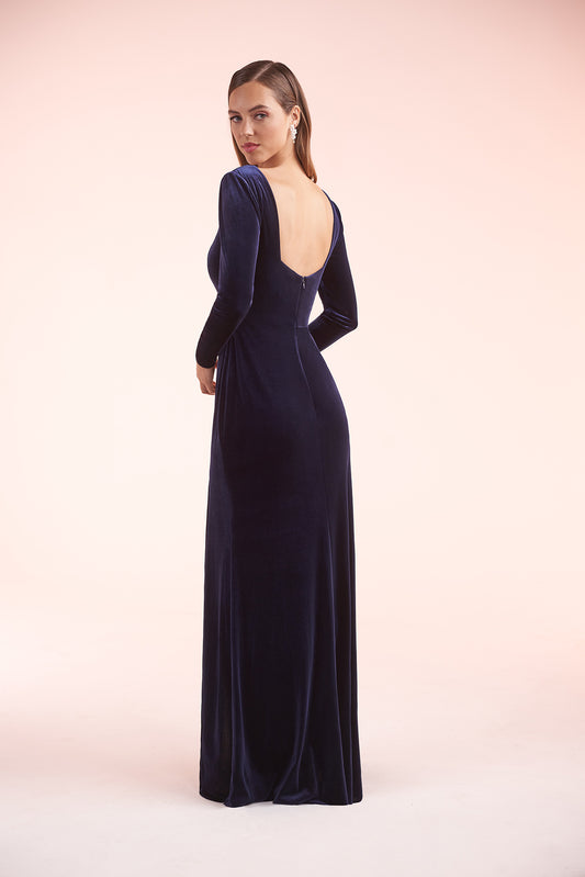 Custom Gown | Gorgeous Fit and Flare Stretch Velvet Gown with V-Neckline and Long Sleeves