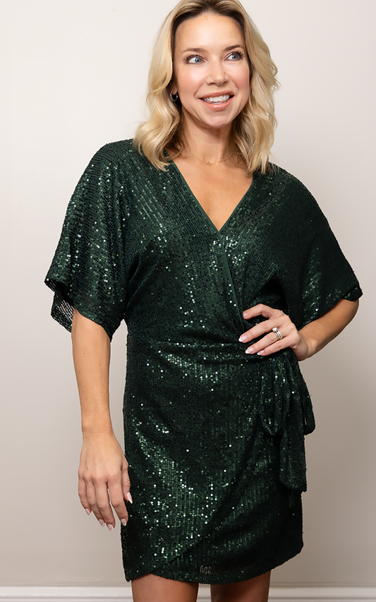 FAUX WRAP SEQUIN DRESS