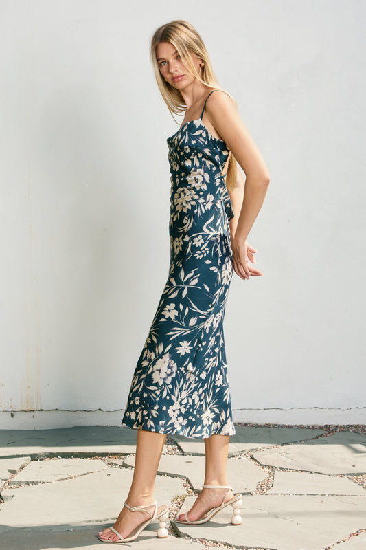 Floral Cowl Neck X Back Midi Dress