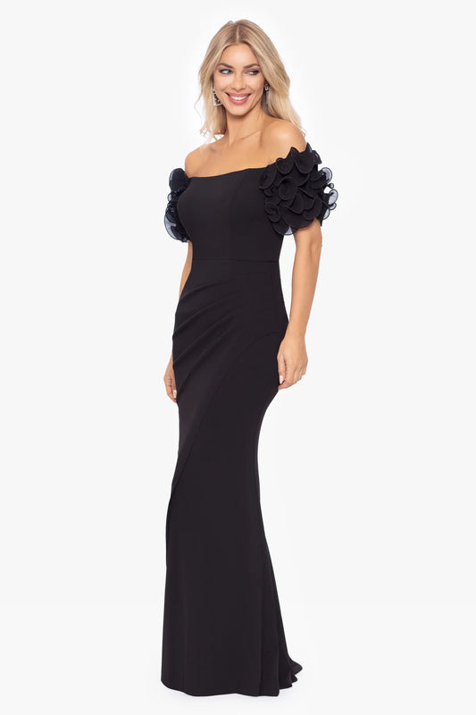 Long Scuba Crepe Off the Shoulder Wire Flower Gown