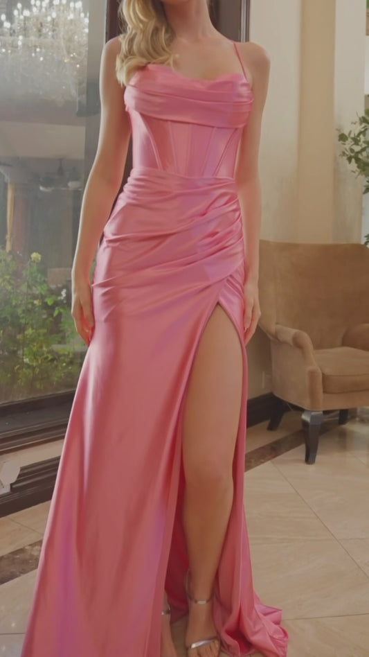 Satin Prom Dress with Cowl Neck and Spaghettic Straps