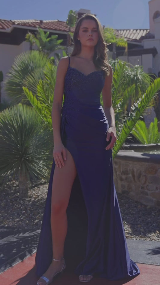 Fitted Shiny Satin Prom Dress with Spaghetti Straps