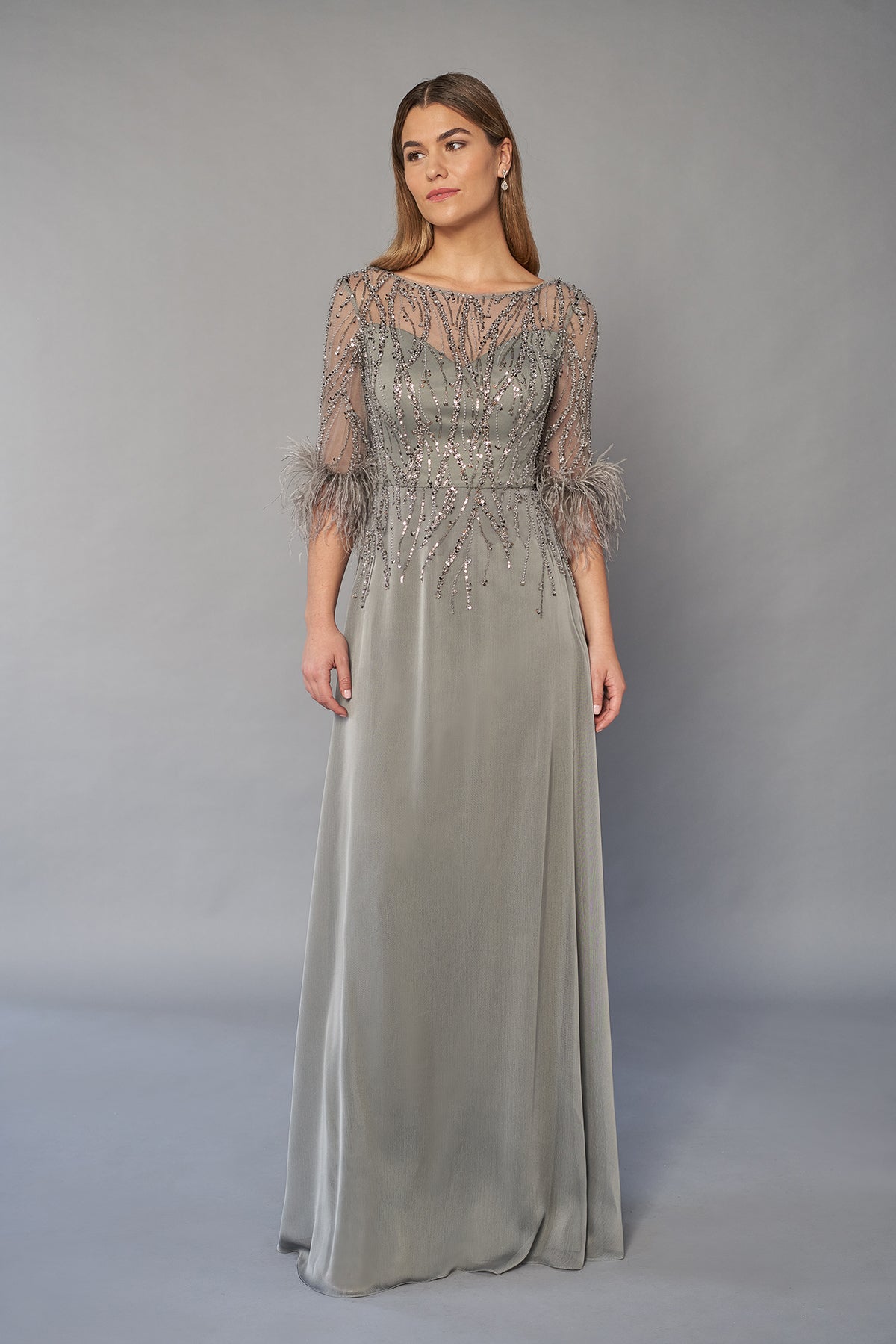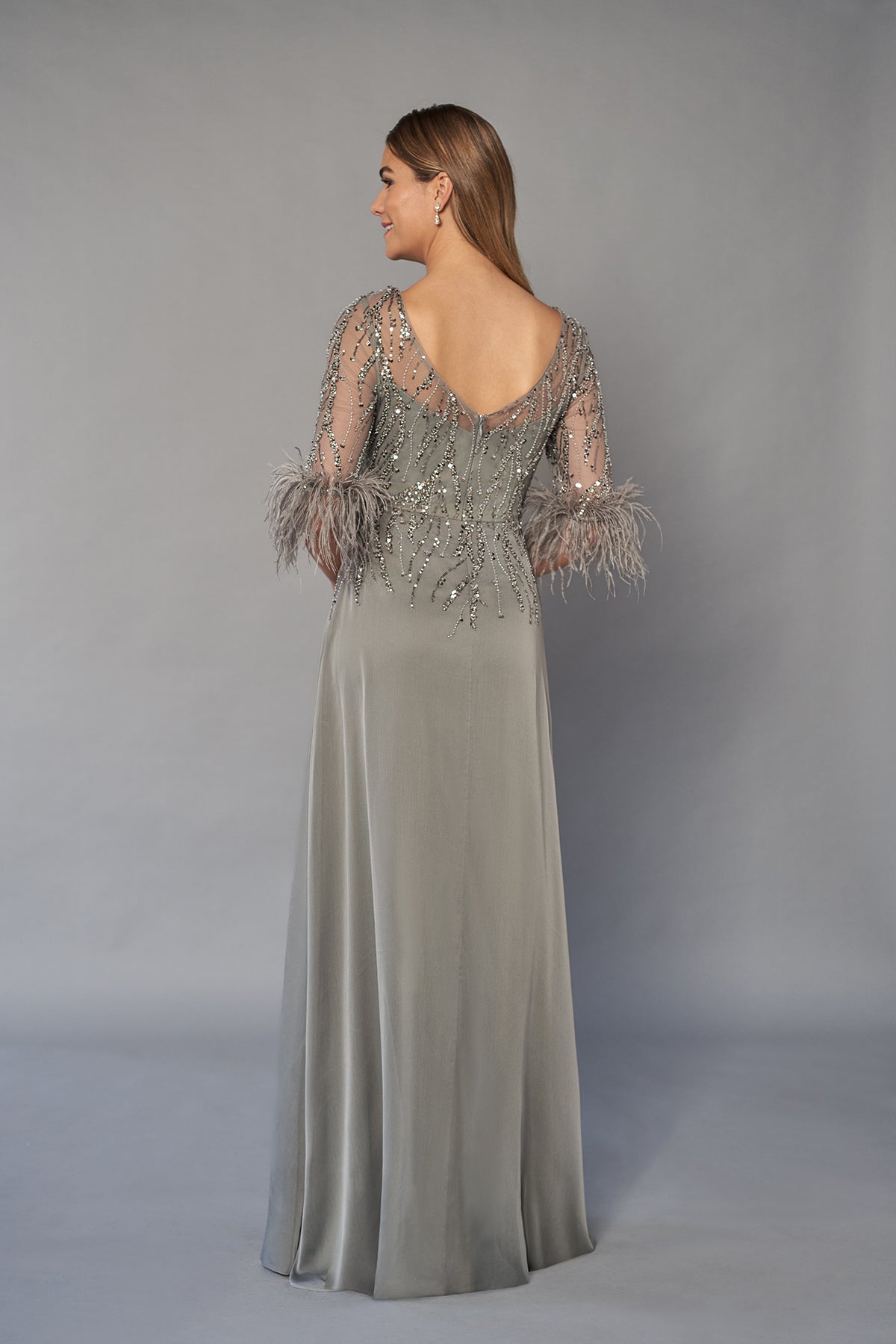 Amazing Andrea Sequin Lace and Jade Tiffany Chiffon A-line gown with stunning sparkly bodice and beaded waistband. The sparkle continues along the front boat neckline and back V-neckline while the sleeves are accented with feathers.