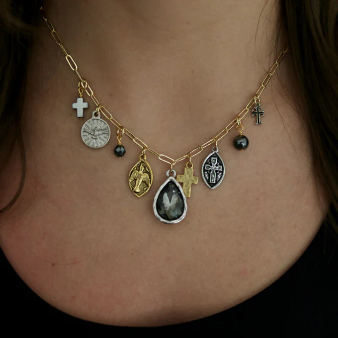 The Charm necklace continues and this on trend version features a mixed metal look that will have you reaching for it everyday! The beautiful smoke bezeled crystal sets the tone on both options and you can choose the whimsical or religious choice to make your statement.