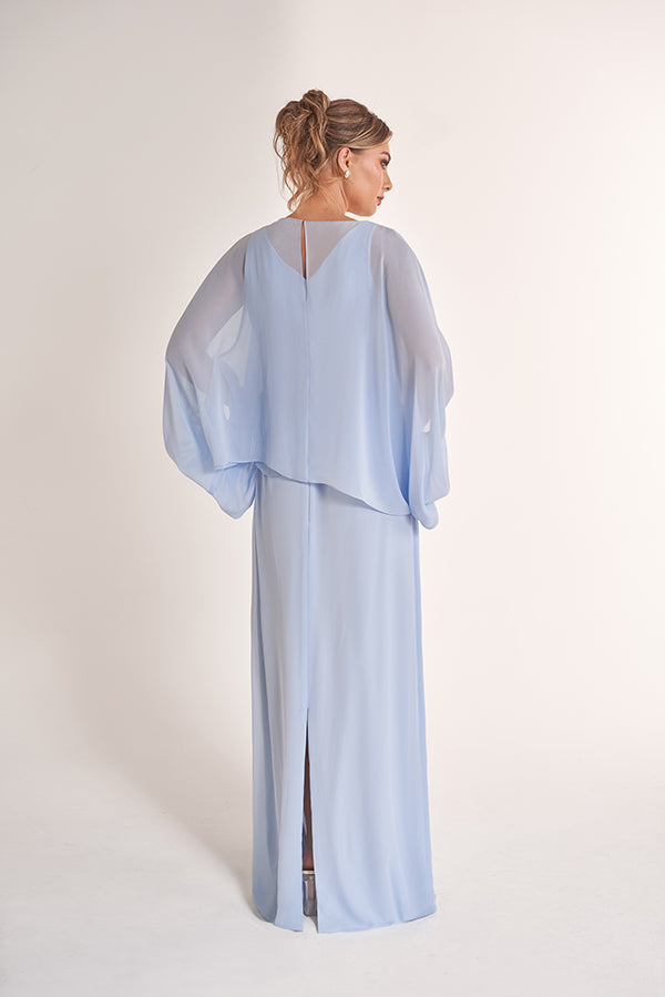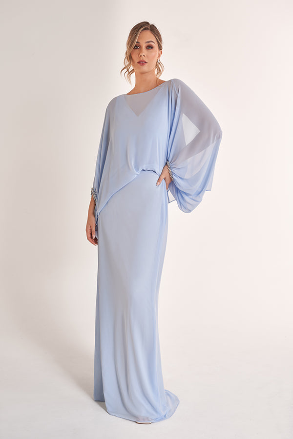 Graceful and stylish, our classic Jade Chiffon gown is made for comfort and beauty. The lovely boat neckline provides coverage and is accented by hand-beaded lace appliques at the shoulders for a touch of excitement. The draped top flows over the body, and is completed with a sheath shape skirt that has a side slit for ease of movement.
