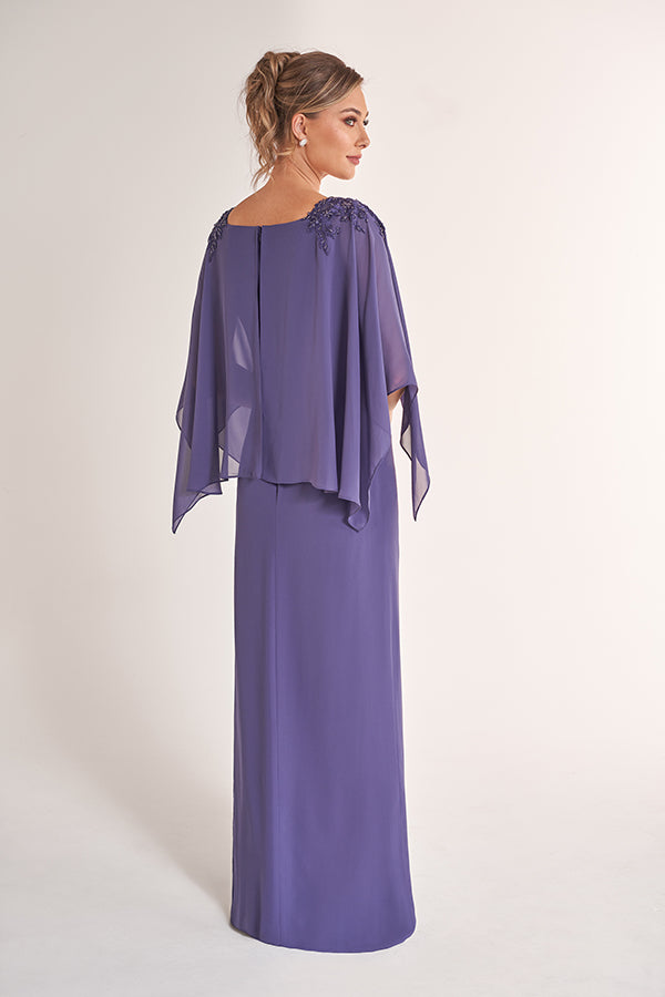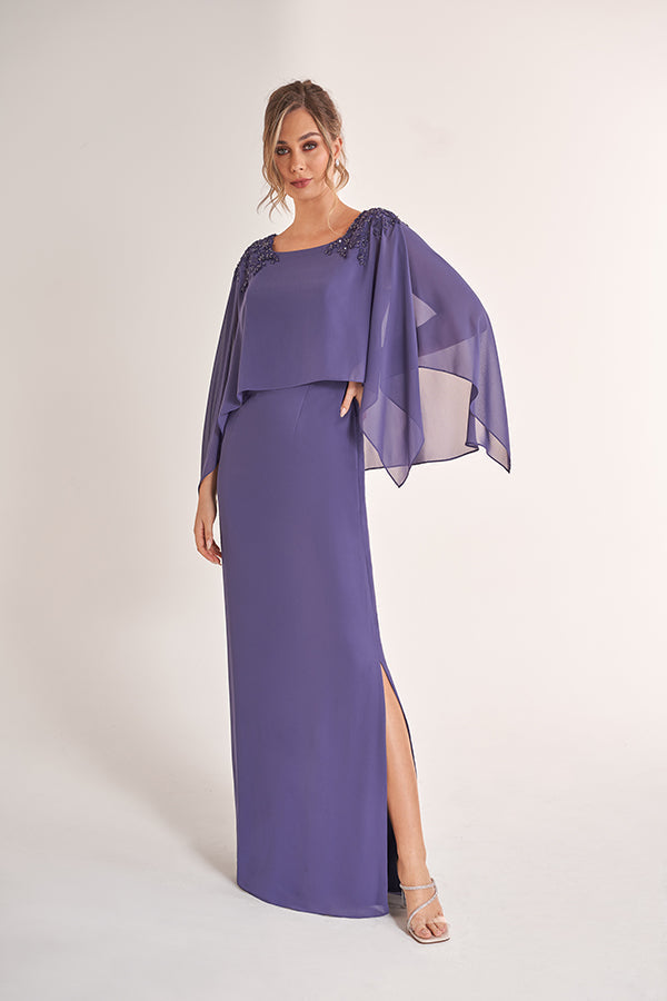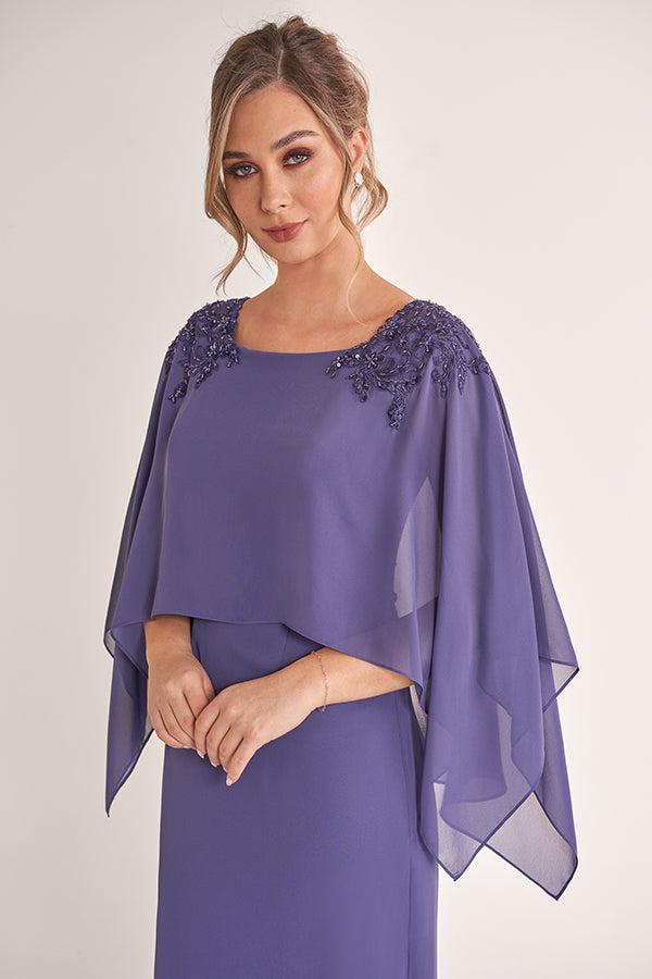 Graceful and stylish, our classic Jade Chiffon gown is made for comfort and beauty. The lovely boat neckline provides coverage and is accented by hand-beaded lace appliques at the shoulders for a touch of excitement. The draped top flows over the body, and is completed with a sheath shape skirt that has a side slit for ease of movement.