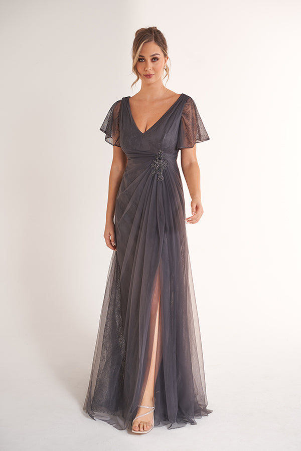 Dreamy Tulle overlays delicate Raschel Lace to create the most romantic A-line dress. A stunning V neckline and soft side gathers shape the body and enhance your curves. A sparkling hand-beaded appliques accents the waistline, while a front slit has been added for dancing and movement.