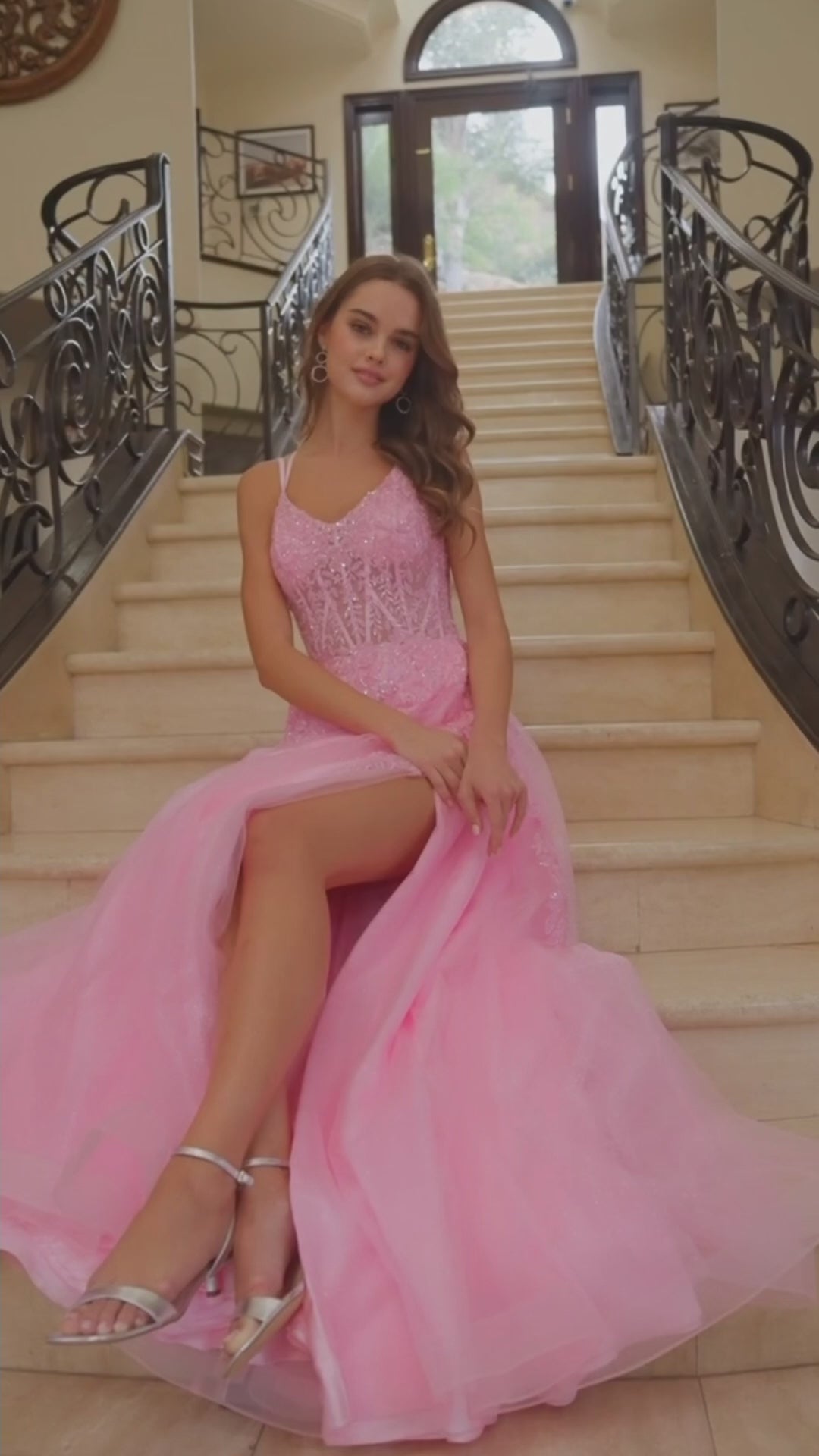 This refined fit-and-flare long gown showcases an elegant V-neckline framed by double spaghetti straps for a touch of modern delicacy. The fully embroidered bodice is enhanced by a sheer, boned waistline that offers both structure and sophistication. A striking high slit adds graceful movement, while the sweeping court train lends a regal finish. The ensemble is completed with a classic lace-up back, ensuring an impeccably tailored and timeless silhouette.