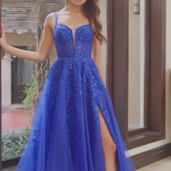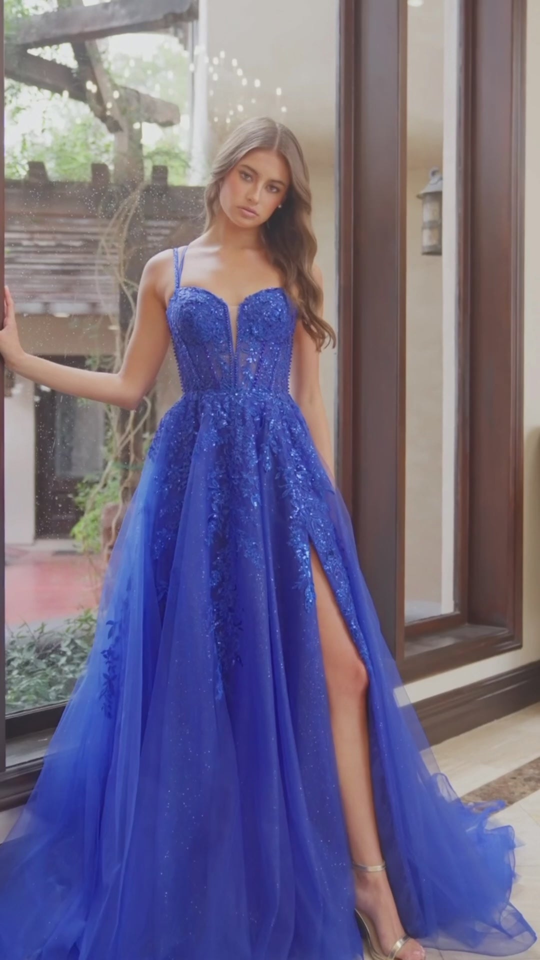 This striking fit-and-flare gown captivates with its semi-sweetheart plunging neckline and delicate double straps. The bodice is richly embroidered and complemented by a sheer boned waistline with eye-catching cutout sides. A high slit brings drama and movement, while the court train and lace-up back complete the look with romantic, sculpted perfection.