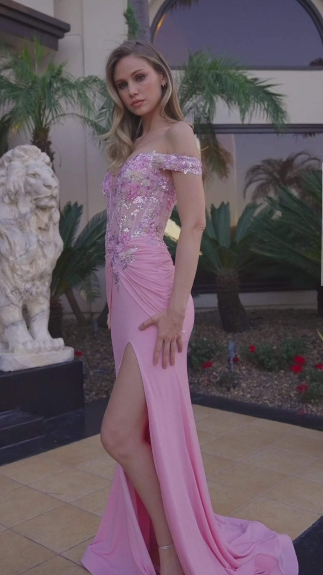 Make a dramatic entrance in this fitted shimmer jersey gown, designed to highlight every curve with radiant elegance. The deep V sweetheart neckline is paired with off-the-shoulder sleeves for a romantic, modern silhouette, while the boned bodice offers sculpted support. Stunning woven embellishments add all-over sparkle, and the lace-up back ensures a perfectly contoured fit. Finished with a thigh-high slit for bold, confident movement, this gown is pure show-stopping glamour.