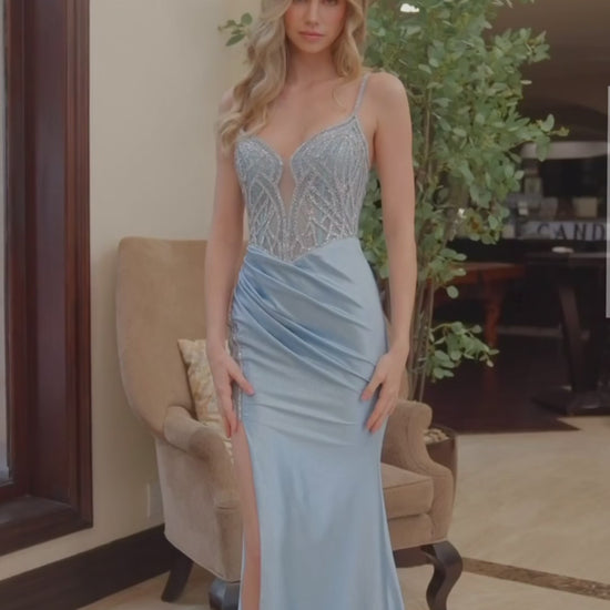 Glow from every angle in this fitted shimmer jersey gown, crafted to hug the body with smooth, luminous elegance. Woven rhinestones blanket the bodice, creating a radiant, high-impact sparkle, while delicate spaghetti straps add a refined, feminine touch. A concentrated rhinestone panel enhances the thigh-slit opening, drawing the eye with dazzling detail. Finished with a floor-length skirt and a bold thigh-high slit, this gown is the perfect blend of sleek sophistication and show-stopping shine.