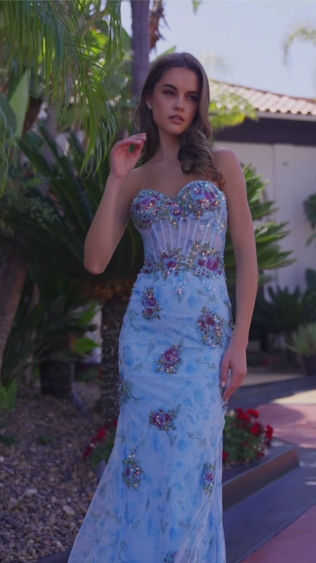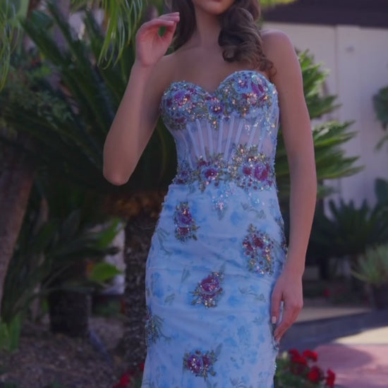 Step into romantic elegance with this fully flower-embroidered strapless gown, crafted from soft tulle for a dreamy, ethereal look. The trumpet silhouette skims and accentuates your curves, while the sheer boned waistline adds sculpted definition with a touch of modern allure. A lace-up back completes the design, allowing for a beautifully customizable fit. This gown is perfect for the woman who loves feminine detail and unforgettable glamour.