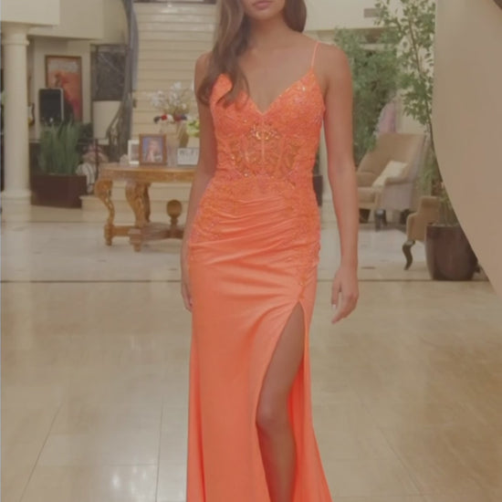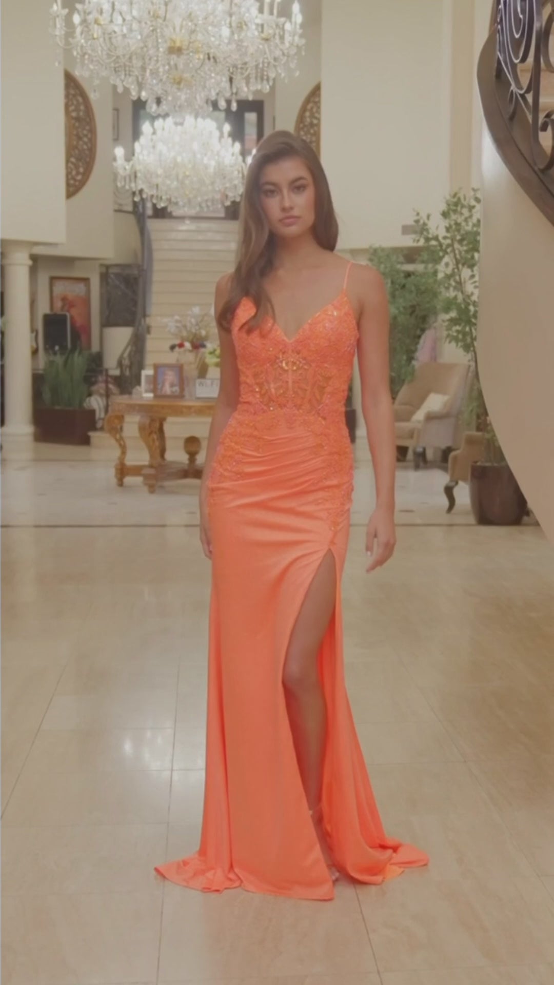 Shimmer with every step in this glitter stretch satin gown, designed to flatter and captivate. The V-neckline and delicate spaghetti straps create a soft, feminine silhouette, while the illusion boned waistline offers sculpted definition. Intricate beaded embroidery adds luxe sparkle across the bodice, and a bold high slit brings confident movement. Finished with a lace-up back for a customizable fit and a sweeping train for dramatic elegance, this gown is made for unforgettable moments.