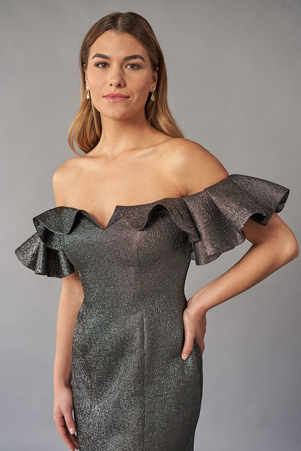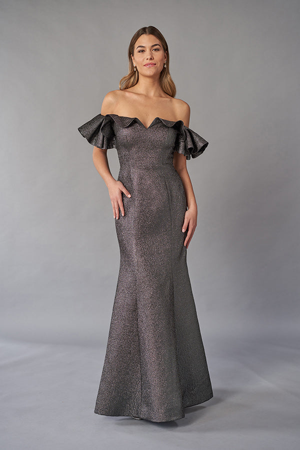 A gorgeous Fanny Metallic Jacquard Fit and Flare gown with off the shoulder ruffle sleeves continuing around the neckline to perfectly frame the face. The luxury of this one of a kind fabric is sure to make a statement.