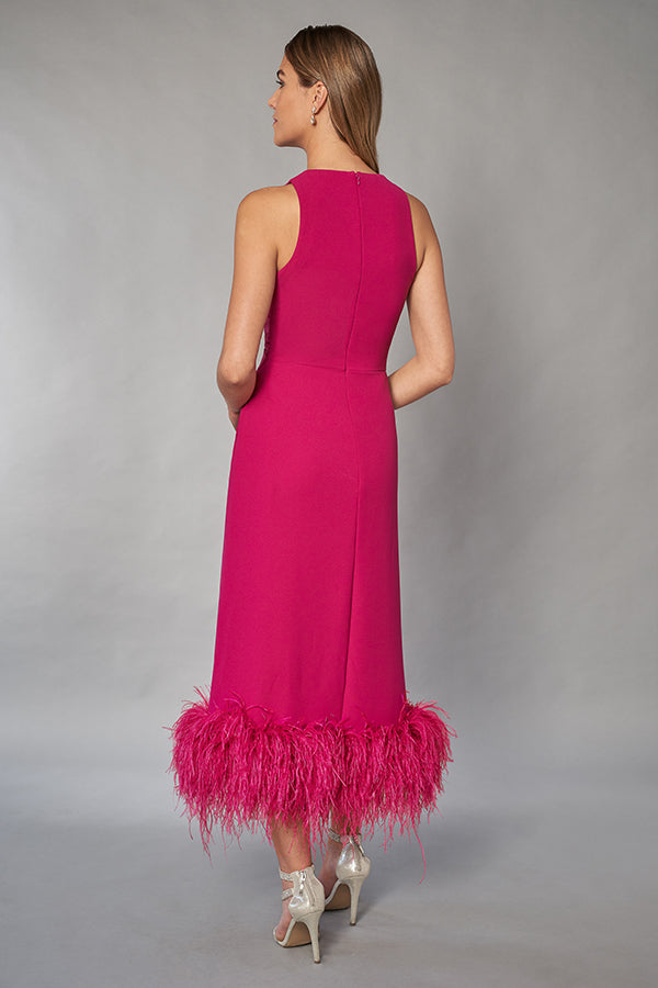 K268056 Memorable Stretch Soft Crepe Tea Length Gown with Accented Feather Hemline and Jewel Neckline