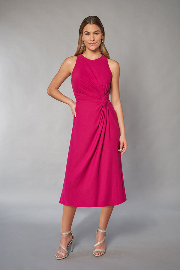 Memorable Stretch Soft Crepe Tea Length gown with hand-sewn accented feather hemline and beautiful jewel neckline. The gentle gathers pull to the side to enhance your figure perfectly.