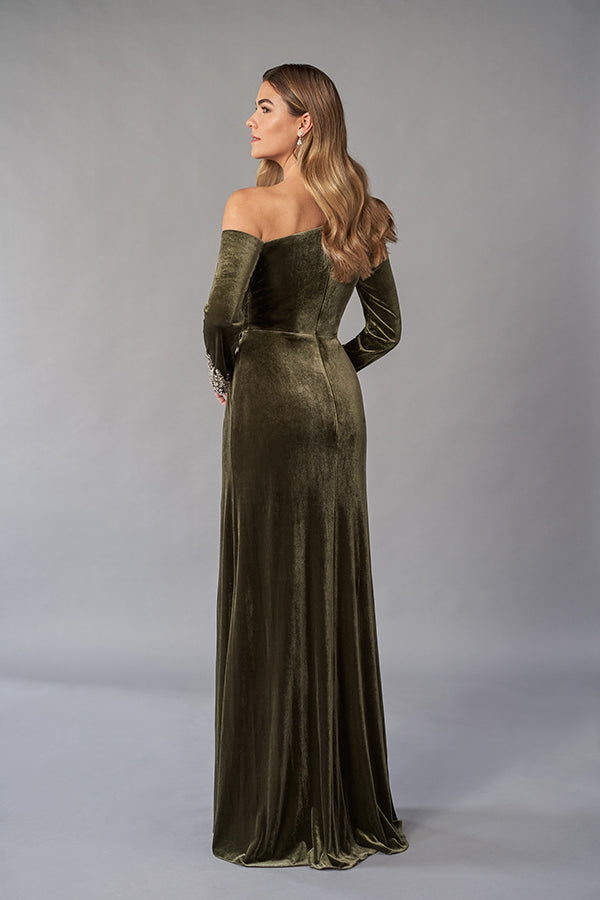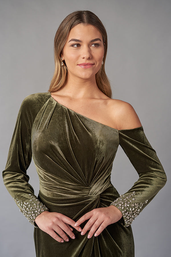 K268058 Luxurious Stretch Velvet Gown with Asymmetrical Neckline and Long Sleeves with Beaded Cuffs
