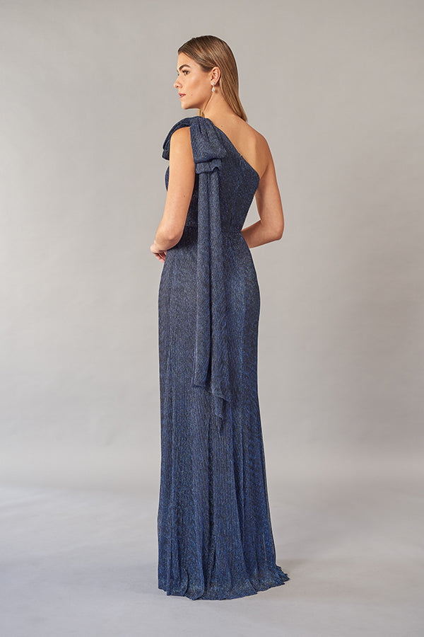 Glamorous Metallic Pleated Chiffon Fit and Flare gown with delicate pleated gathers on the side. The chic one shoulder design is finished with bow detailing that flows into a sash down the back while a slit has been added for easy walking and movement.
