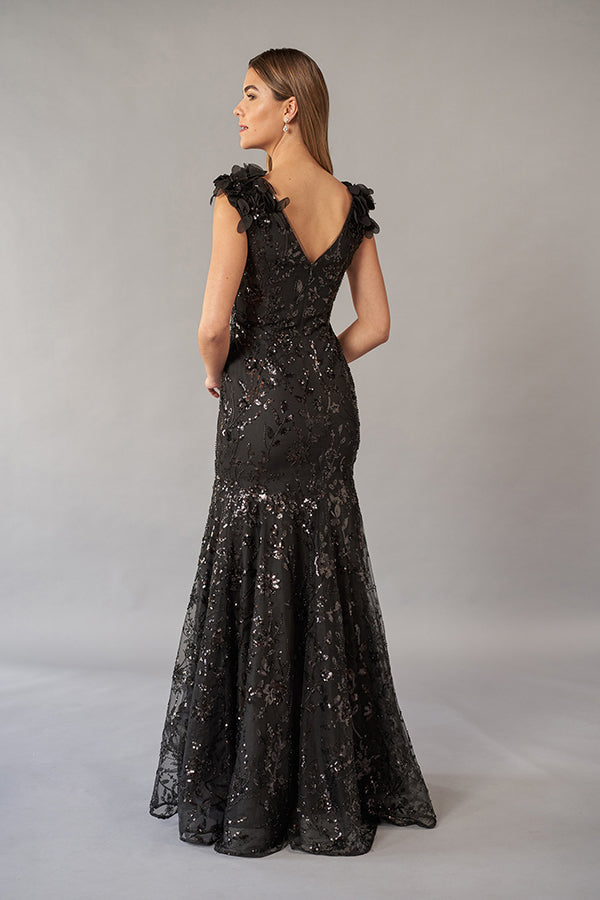 Breathtaking Aurora Sequin Lace mermaid gown with plunging neckline accented at the shoulders with 3D flowers and beading. The mermaid shape skirt adds flare and movement while you make your entrance.