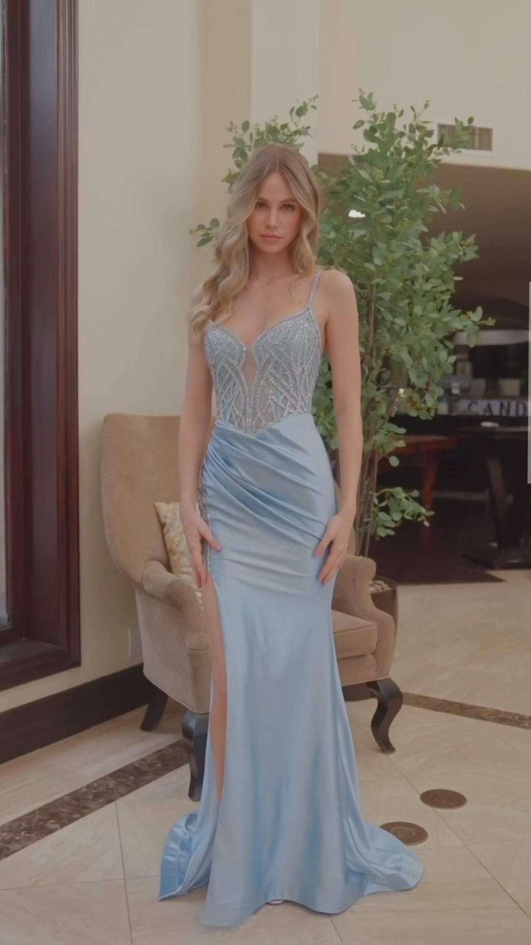 Make every moment a spotlight moment in this fitted shimmer jersey gown, elevated with woven rhinestone embellishments that sparkle from every angle. Slim spaghetti straps add a delicate, feminine touch, while the lace-up back allows for a sculpted, customizable fit. The floor-length skirt features a thigh-high slit that creates a stunning leg-lengthening effect—perfect for a confident, show-stopping entrance. This gown is sleek, radiant, and unforgettable.