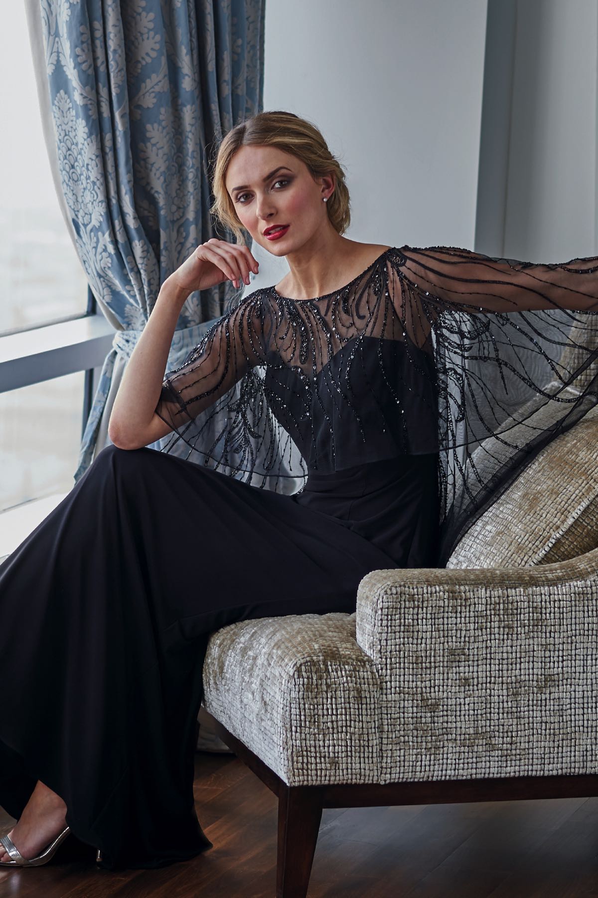 Beautiful matte jersey Mother of the Bride dress with a boat neckline and simple V back. A gorgeous beaded cape covers the shoulders and bodice. Flare skirt and sweep train complete this look.