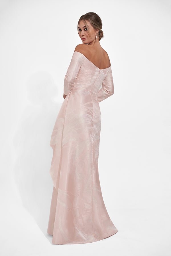 K278001 Elegant Off-the-Shoulder Frances Jacquard Fit and Flare gown with Portrait Neckline and Quarter Sleeves