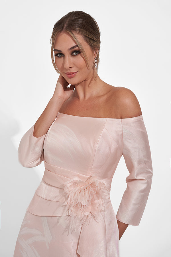 Make your entrance memorable in this elegant off-the-shoulder Frances Jacquard fit and flare gown that is sure to make a statement. The flattering portrait neckline with 3/4 sleeves perfectly frames the face while the pleated waistline shapes the body and is adorned with a flower detail and a cascading ruffle.