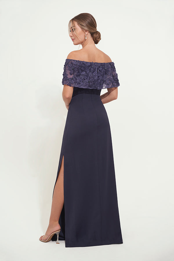 Feel exquisite in this sheath gown crafted of Royal Crepe and Organza. The gorgeous Organza portrait collar highlights the shoulders and has hand-sewn flowers and beading added to create an air of luxury. A sexy side slit has been added to the skirt for style and movement.