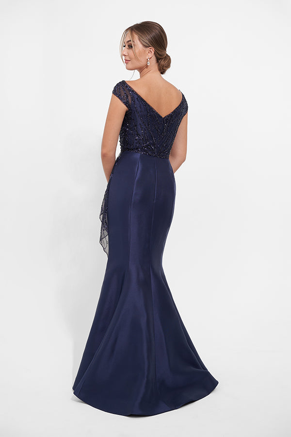 Make an unforgettable impression in this sophisticated mermaid shaped gown. Designed with our Andrea Sequin Lace and Mikado, this style is a harmonious blend of opulence and allure. The off-the-shoulder portrait neckline beautifully frames the face while the feminine ruffle drapes from the waistline and catches the light with every step.