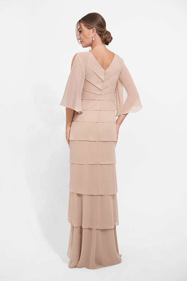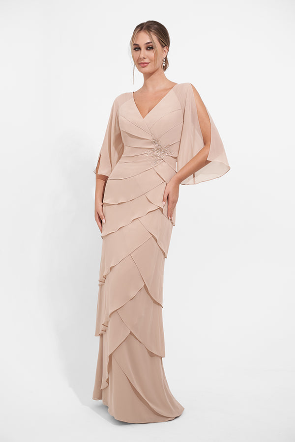 Captivate the room in this romantic A-line gown designed in our Jade Chiffon. The angled layers flatter the figure with effortless grace while the V-neckline offers both modesty and allure leading to the open slit quarter sleeves. The bodice is highlighted with a hand beaded applique for added sparkle.
