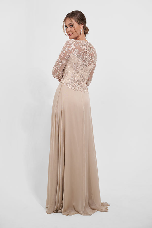 Indulge in this romantic gown crafted from our Becky Embroidery Lace and Jade Tiffany Chiffon. The delicate fitted long sleeves and classic V-neckline is flattering on every shape. The flowy A-line skirt has soft draping from the waistline that makes this gown the perfect blend of elegance and comfort. A front slit has been added to complete the look.