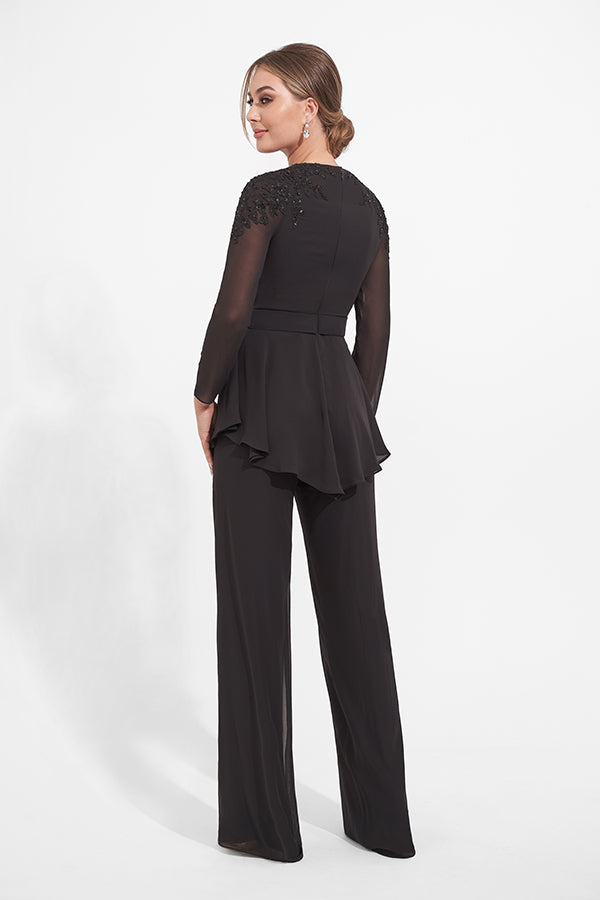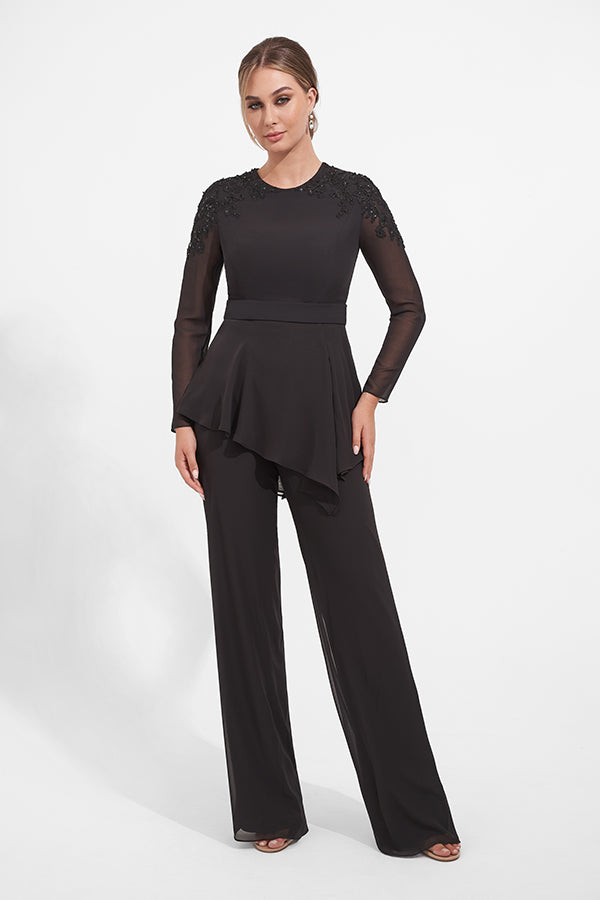 Nothing says chic more than this stylish two piece ensemble created from our Jade Chiffon. The sophisticated long-sleeve top has a bateau neckline adorned with Beaded Embroidered Lace detail throughout the shoulders and a high-covered back. The attached chiffon belt defines the waist and the flowing asymmetrical edge adds interest to the top. The flowy pants will ensure you have the comfort and versatility that's simply irresistible.