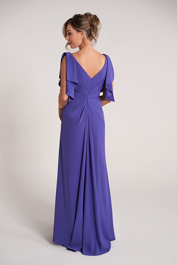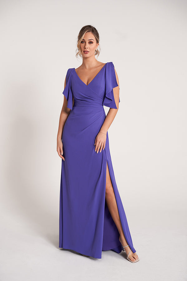 Modern and elegant describes this Fit and Flare gown made in our Stretch Soft Crepe. A beautiful V neckline and soft flutter sleeves compliment the side gathered bodice, while the back features additional gathers for shaping and a slit has been added for easy movement.