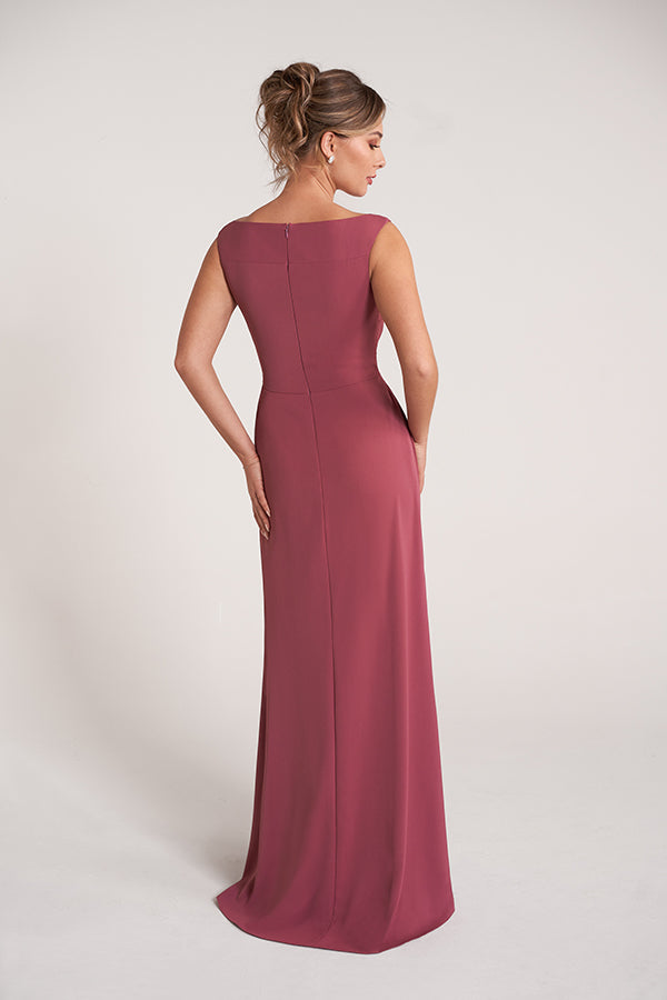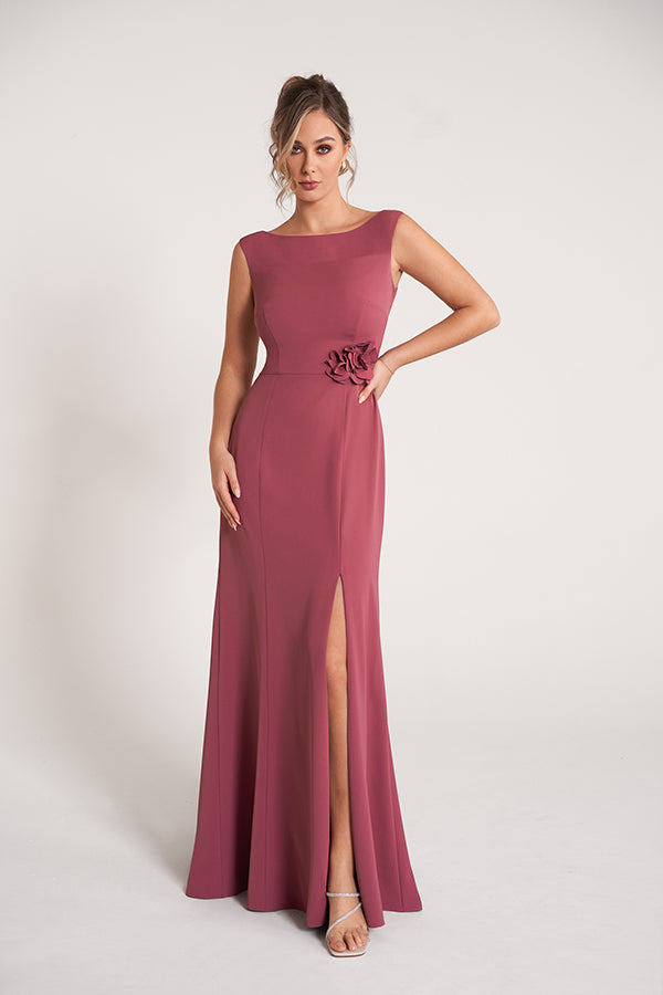 Sophistication and elegance in our Royal Crepe with a lovely boat neckline and cap sleeves. The natural waistline features a 3D hand-made flower detail for just a touch of romance. A Fit and Flare shaped skirt has a front slit that completes the look.