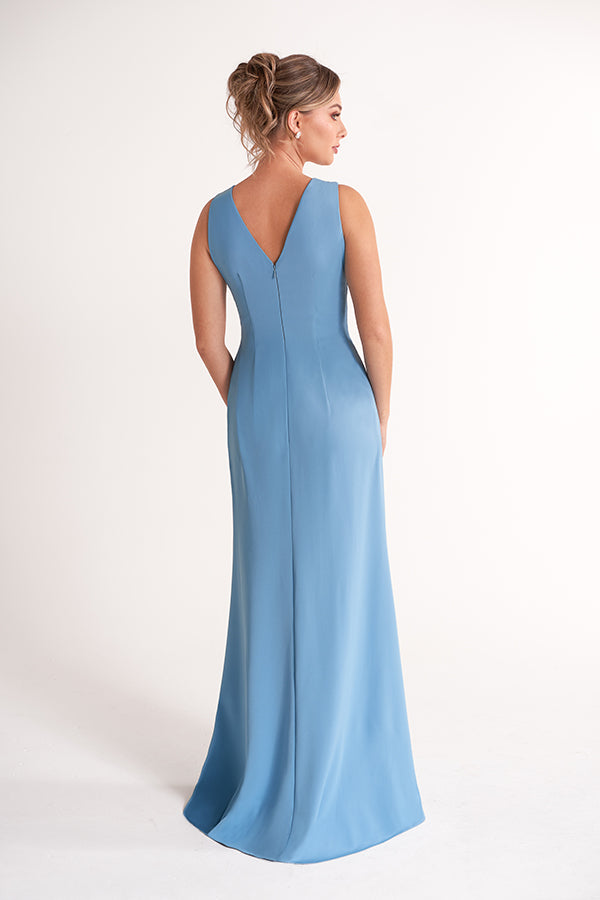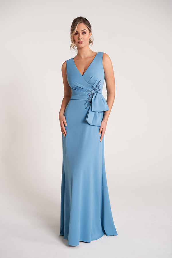 A flattering V neckline gives this gown crafted in our Royal Crepe drama and elegance. The bodice gathers at the waistline, detailed with hand-beaded embroidery on the sash. A Fit and Flare shaped skirt completes this look that’s perfect for any occasion.