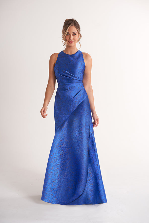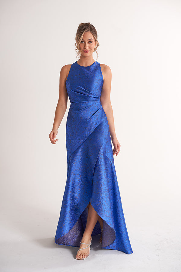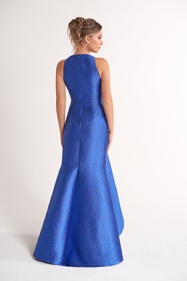 Make a statement in our dramatic Georgia Jacquard gown with a halter neckline that shows off the shoulders. A thoughtfully designed bodice features side gathers to flatter the figure, while an exciting high low ruffled hemline highlights your shoes to dance the night away.