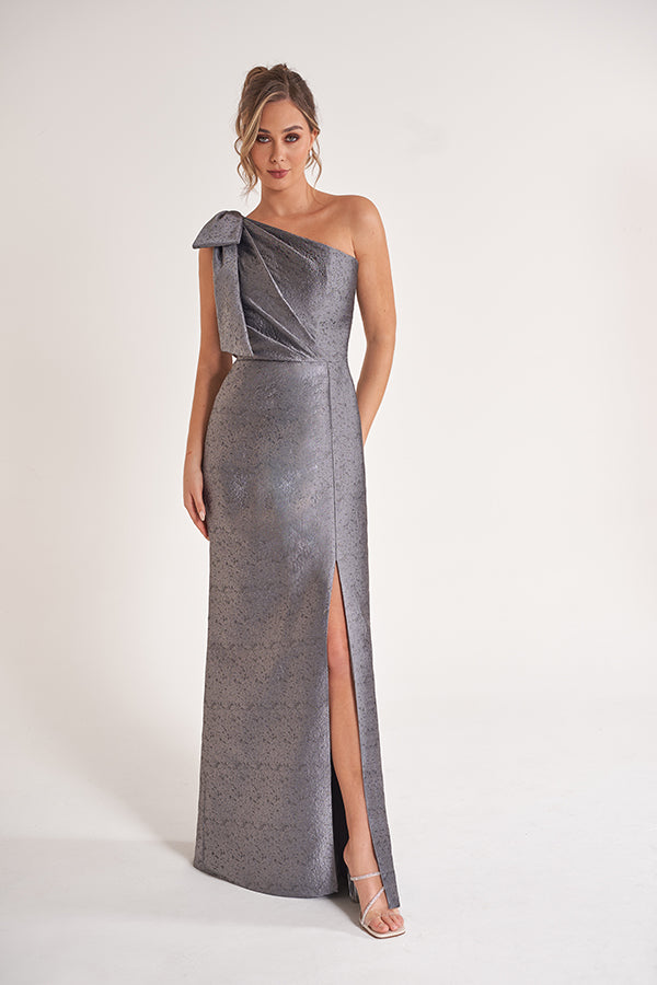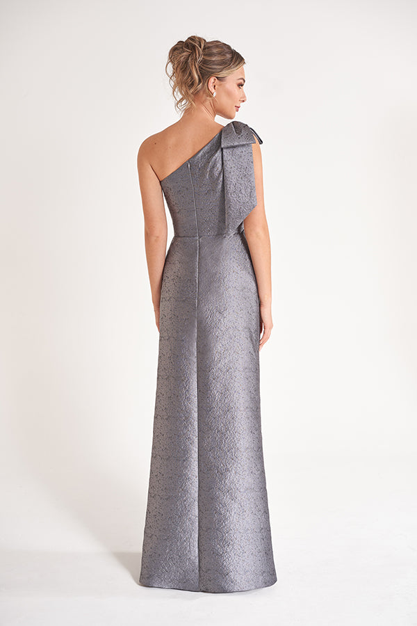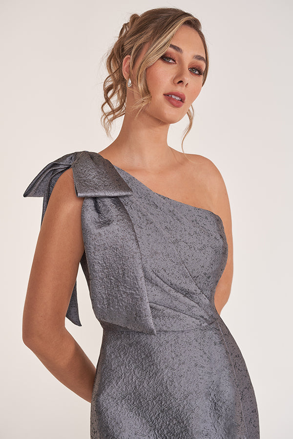 Elevate your style effortlessly in our sleek Georgia Jacquard gown. A chic one shoulder neckline is accented by a bow and sash leading to soft gathers at the natural waistline. The sheath shaped skirt is the ideal look of sophistication and grace.