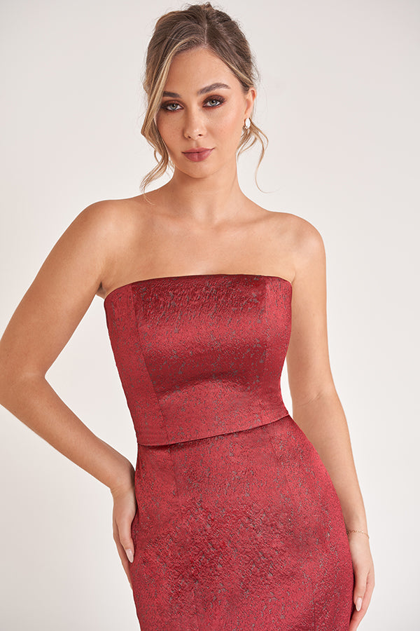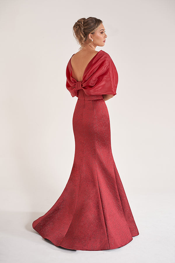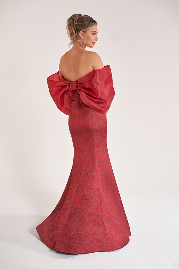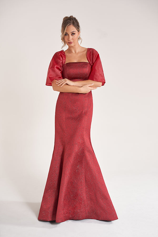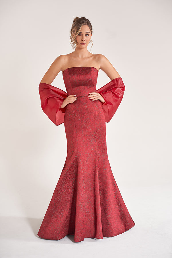 Turn heads in this striking strapless gown crafted in our Georgia Jacquard. Its fitted bodice accentuates the waist, while the flared skirt gracefully cascades from the knees, creating that amazing silhouette known for its flattering effect. A Pearl Organza off the shoulder jacket provides coverage as well as versatility to an already dramatic look.