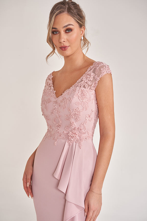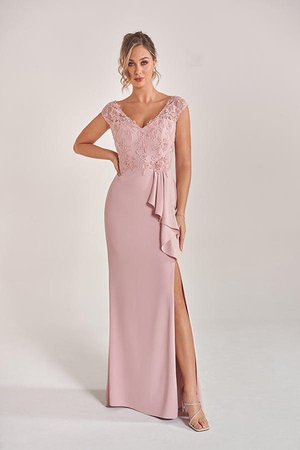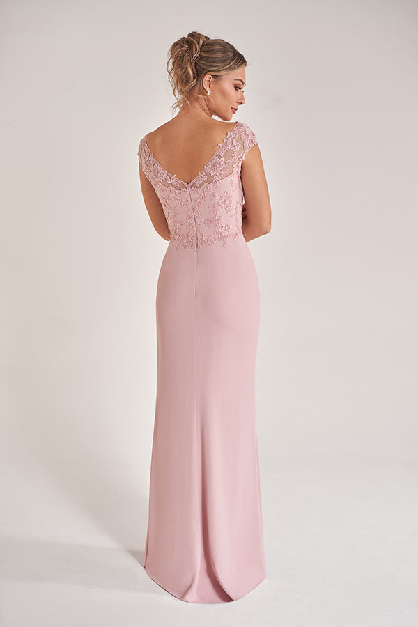 This ultra-flattering Fit and Flare gown exudes understated elegance. Delicate hand-beaded embroidery lace decorates the bodice, with sheer cap sleeves. The fitted bodice cinches the waist, while the draped Stretch Soft Crepe skirt cascades into a ruffled slit, to create breathtaking movement.