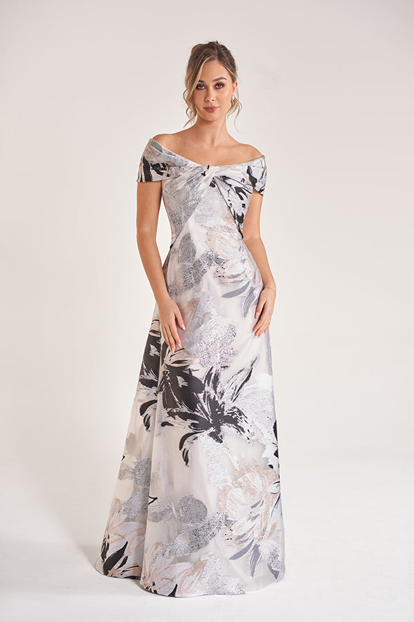 K278060 Exquisite Giselle Organza Jacquard A-Line Dress with Portrait Neckline and Twisted Bodice