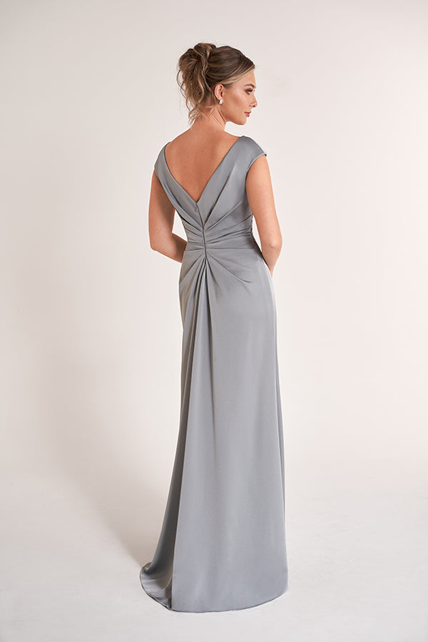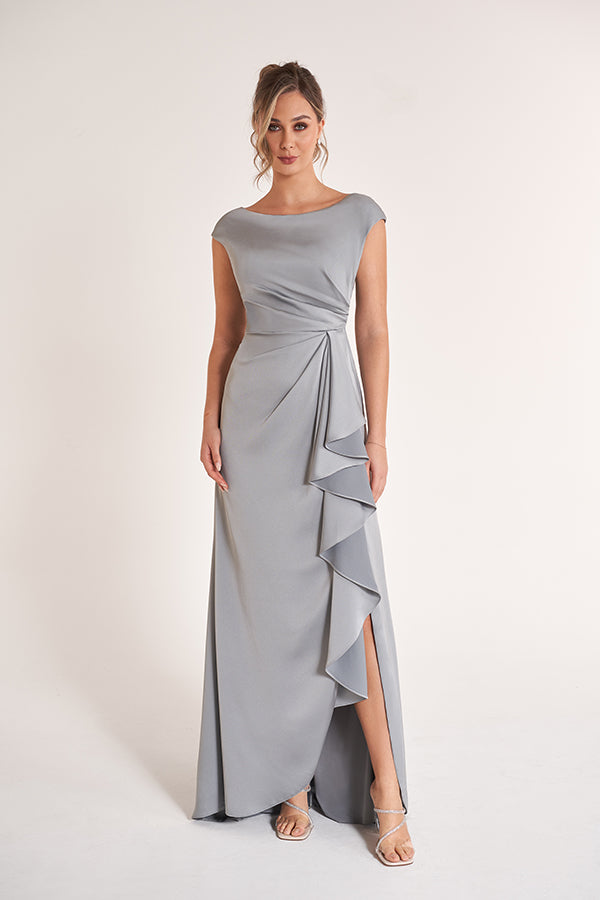 Elevate your style with this impossibly chic gown. With a graceful boat neckline and cap sleeves, this gown highlights your shape in all the right ways with soft gathers, while the luxurious Crepe Back Charmeuse skims your figure for a flawless fit. The Fit and Flare shape skirt has a cascading ruffle detail over a sexy slit that shows just the right amount of glamour and lets you move with grace.
