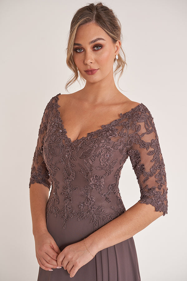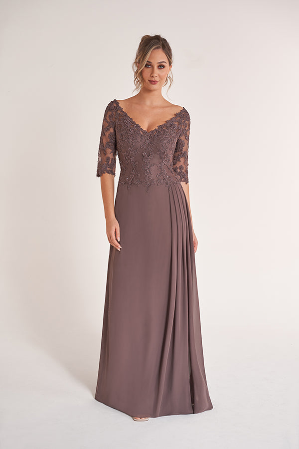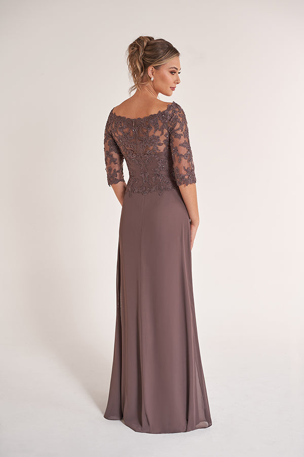K278064 Elegant Lace and Chiffon A-Line Gown with Portrait Neckline and Three-Quarter Sleeves