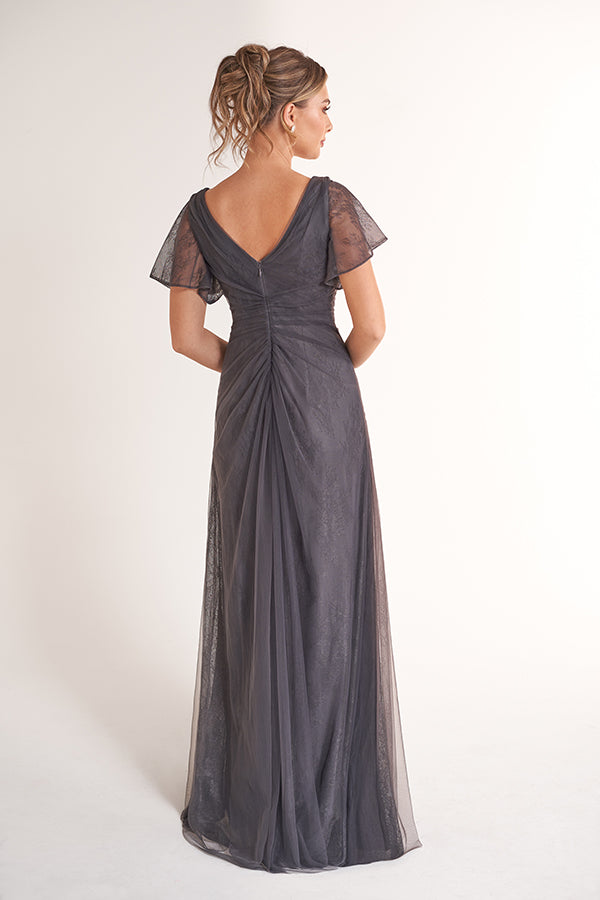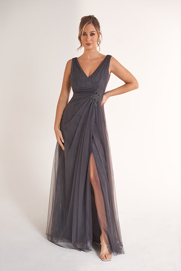 Dreamy Tulle overlays delicate Raschel Lace to create the most romantic A-line dress. A stunning V neckline and soft side gathers shape the body and enhance your curves. A sparkling hand-beaded appliques accents the waistline, while a front slit has been added for dancing and movement.