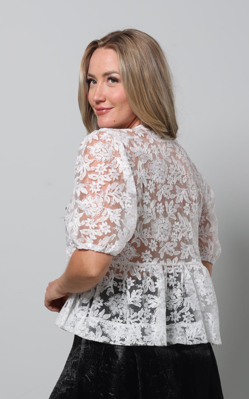 Elevate your style with this Lace Peplum Top featuring delicate embroidered lace and a flattering peplum hem that enhances your silhouette. The open round neckline is accented with elegant satin tie strings, adding a touch of sophistication. Short puff sleeves with elastic edges provide comfort and a charming finish. Perfect for dressing up or adding a feminine touch to your everyday look.