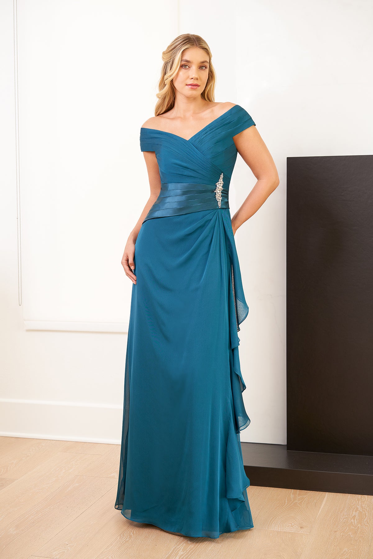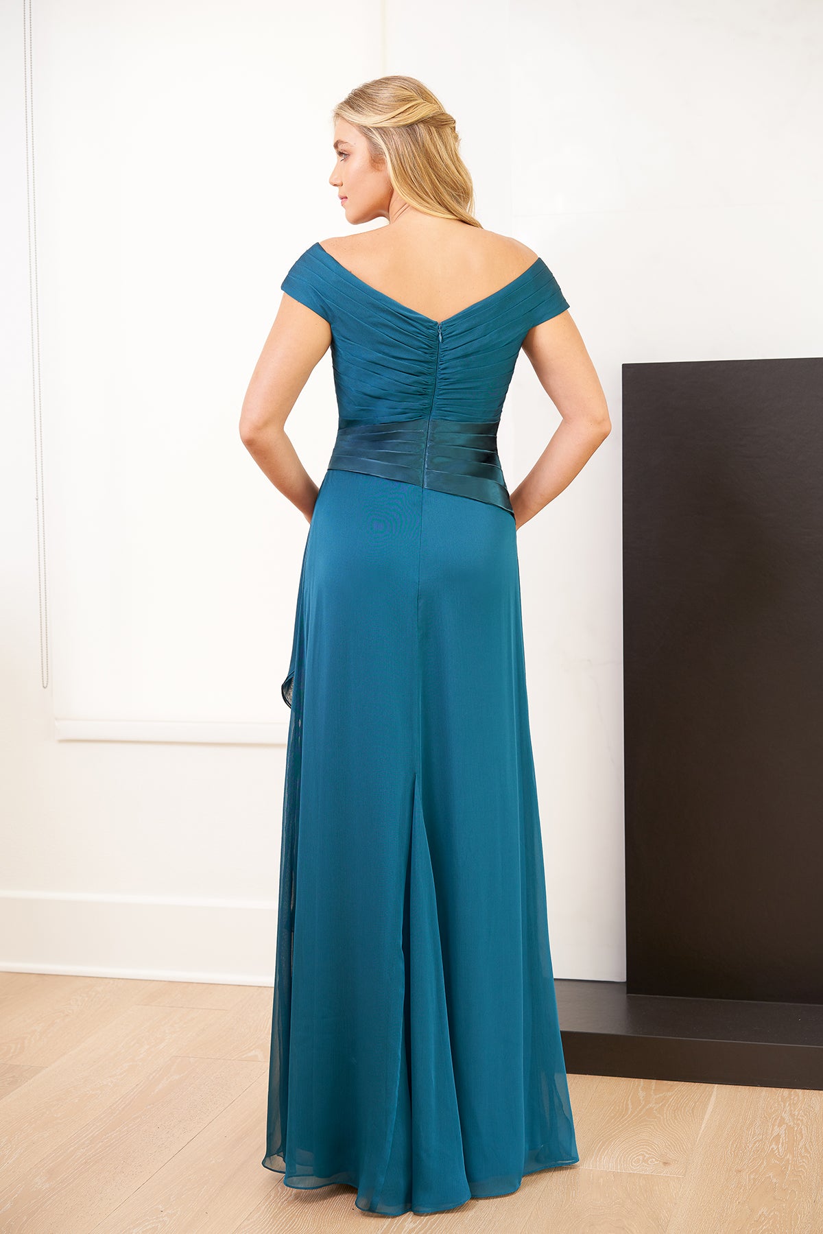 J1161 Long Portrait Neckline Tiffany Chiffon Dress with Accent Satin Waistband and Sash