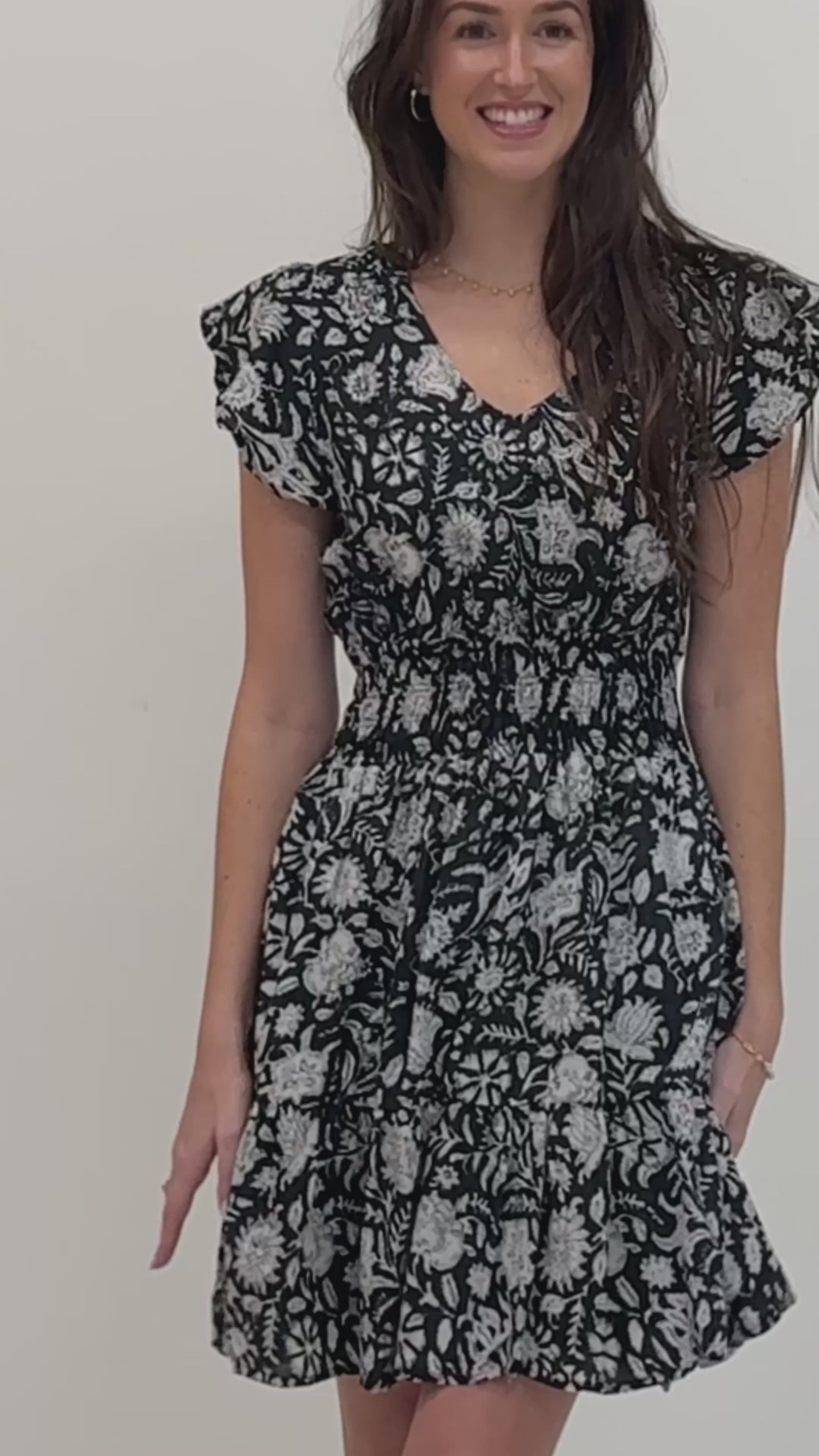 Turn heads with this elegant black and white floral dress, featuring flutter sleeves and a smocked waist for a flattering fit by Dylan. The flowy tiered skirt adds a playful touch, making it perfect for any occasion, from brunch to an evening out. Pair it with sandals for a chic and effortless look!