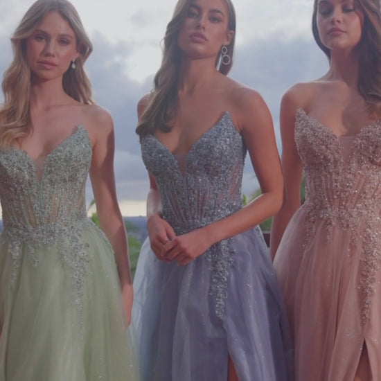 Shine your way into the room with this mesh gown featuring a boned bodice, modern peaked neckline, and sequin embellishments that catch every light. The glitter-dusted A-line skirt flows effortlessly with a thigh-high slit for elegant movement, while the lace-up back gives you the perfect adjustable fit. A stunning choice for prom and formal events when you’re ready to stand out with style.