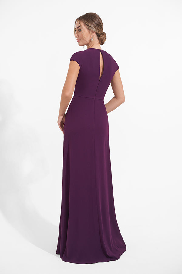Modern and elegant describes this fit and flare gown made with a flattering V-neckline and cap sleeve. Designed in Soft Stretch Crepe, the bodice features gathers that gently twist at the center waistline while the back has a narrow keyhole opening. The skirt has an added front slit to complete the look.